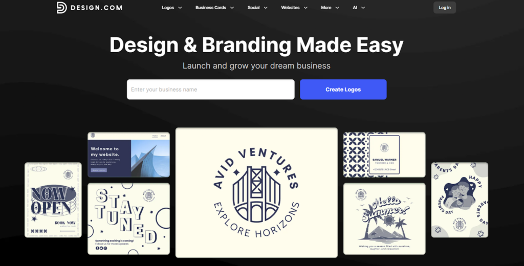 Design.com provides a wide array of logo design and branding services by combining AI-based tools with customization options that will allow businesses of all sizes to create their own logos and branding elements.
